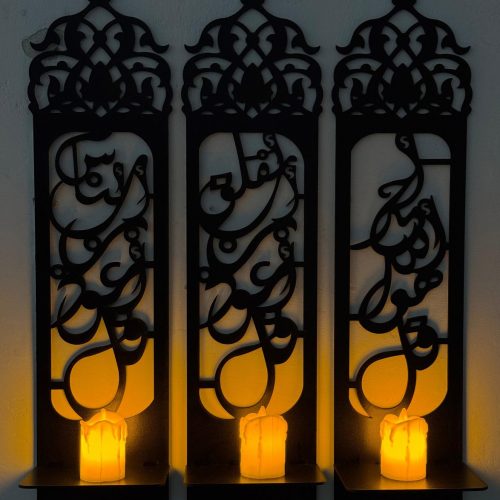 Set of 3 candle shelves featuring beautiful Arabic calligraphy of the 3 Quls. Crafted from 3mm MDF with a sleek black finish, perfect for adding spiritual elegance to any space.